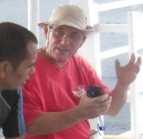 Tom Bennett above the wreck site of the Doko Maru in Romblon Bay, with Peter of Three "P's" Dive Centre. Philippines.