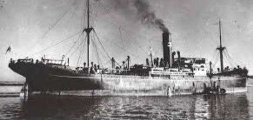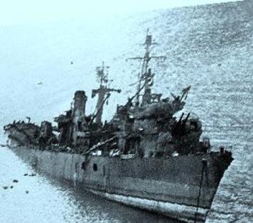 This photo shows T11 a brand new Japanese army transport ship immediately after it was attacked by US planes, San Isidro Bay, Leyte, in December1944. She is sinking fast and soldiers are jumping into the sea from the stern, 375 Japanese lost their lives that afternoon.
